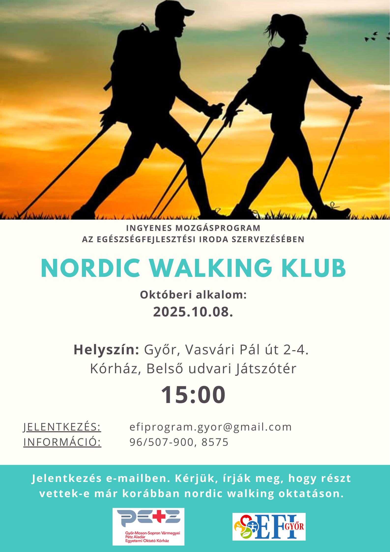 Ingyenes mozgásprogram az Egészségfejlesztési Iroda szervezésében Nordic Walking KLUB októberi alkalom: 2025.10.08.