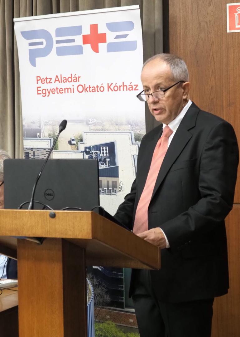 Ezután történelmi áttekintést adott Győr két és fél évszázada kezdődő gyógyító munkájáról: az első városi kórháztól Nyugat-Dunántúl mai, központi intézményéig. Külön kiemelte Petz Lajos és fia, Petz Aladár személyének, munkásságának fontosságát, akik révén a győri kórház országos hírnévre tett szert. A jelenlévőkhöz szólva megjegyezte: